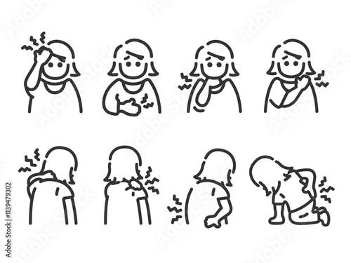いろいろな身体症状の、女性のアイコン(線画)のイラストセット