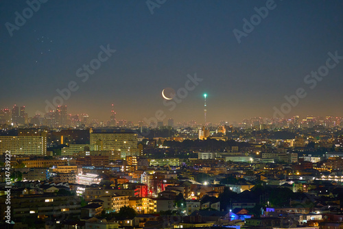 神奈川県川崎市多摩区から東京都狛江市、都心方面に昇る下弦の三日月とおうし座のすばるを見る