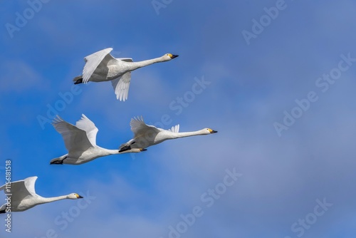 青空バックに優雅に飛ぶコハクチョウの群れ