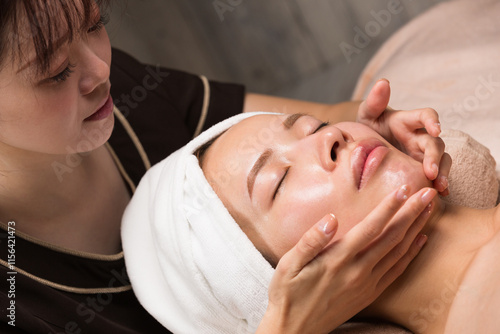 若いアジア人のエステティシャンはフェイシャルマッサージをしています。