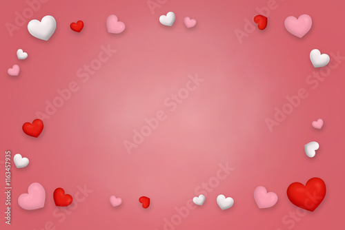 立体的な白と赤とピンクのハートが並ぶ四角いフレームのピンクの背景