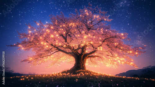 ライトアップされた千年桜と星空の調和が生む春の幻想的な夜
