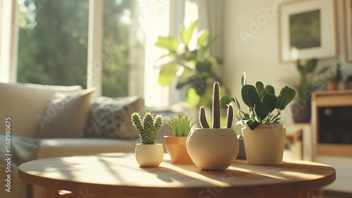 北欧デザインのリビングテーブルに並ぶ小さなサボテンと観葉植物、柔らかな自然光が映す癒し