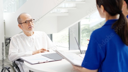 介護士に説明を受ける高齢者