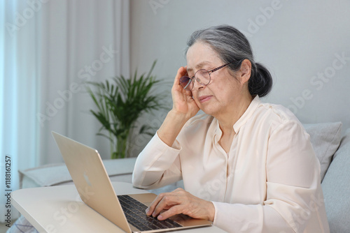 눈 피로를 느끼는 노인 여성 _ 노안의 증세 _ 안구건조증 _ 두통