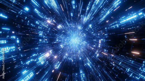 放射状に広がる青い光とデータの流れを表現する回路基板