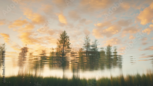 水面に映る逆転した世界が広がる湖畔の幻想風景