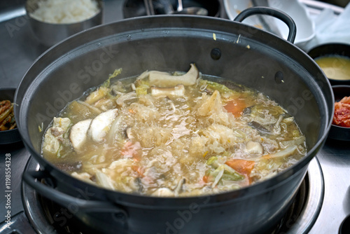 식탁 위에서 만두 전골을 맛있게 끊이고 있는 모습