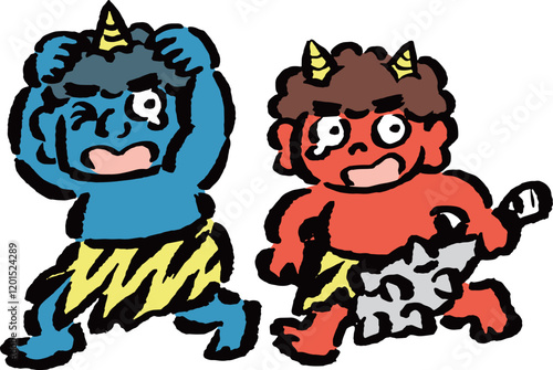 逃げる赤鬼と青鬼 筆タッチ手描きイラスト