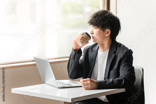 カフェ・シェアオフィスでパソコンを使って仕事するビジネスマン・男性