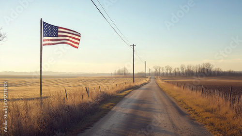 田舎の静かな道に揺れるアメリカ国旗と柔らかな光景
