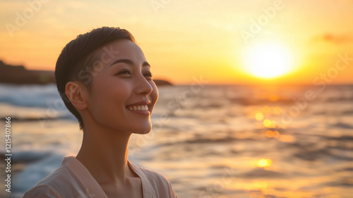 海辺で波と戯れながら笑顔を浮かべるベリーショートの日本人女性の穏やかなポートレート