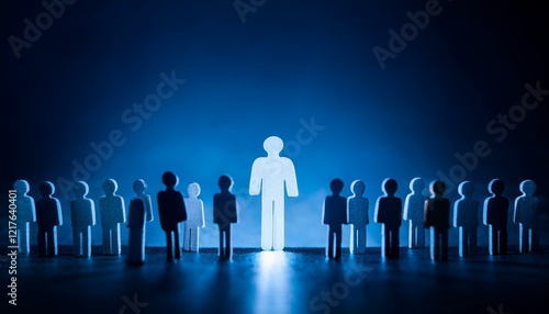 파란색 톤의 어두운 공간에 있는 수많은 인물 실루엣 중 하나만 은색으로 빛나며, 은은한 조명이 중앙의 인물에게 집중되어 있다