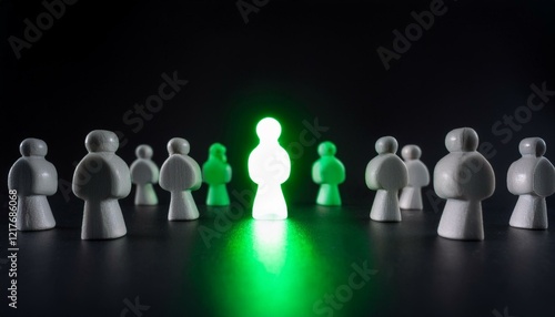 검은 배경 위에서 흐릿한 회색 인물들 사이에 한 인물이 녹색 빛으로 강렬하게 빛나며 중심에 자리 잡는다
