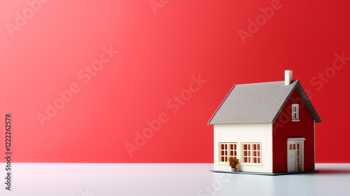 かわいい家の模型、余白のある赤い背景