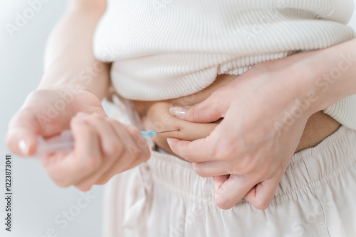 お腹をつまんでインスリン注射・ダイエット注射・不妊治療薬を注射する女性