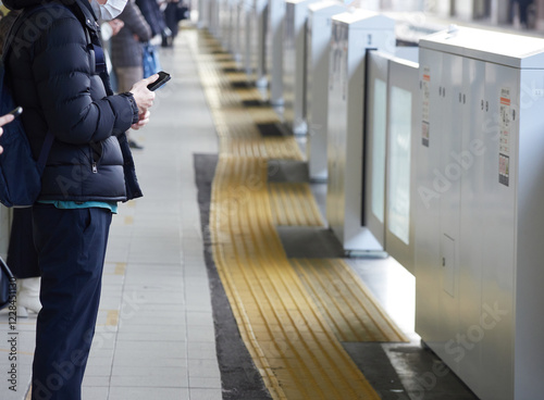 冬の朝の電車の駅のホームでスマホを見ながら電車待ちの人々の姿