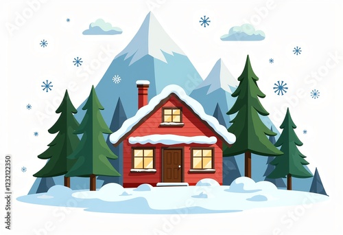 冬の山小屋:シンプルなベクター、フラットイラスト、松の木、雪の結晶、白い背景、カラフルなデザイン、可愛い漫画スタイル、レイヤークリップアート、クリーンな線、ベクターグラフィックス。
