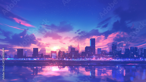 ネオンと夕焼けの融合|ロマンチックなシティビュー|近未来の幻想都市