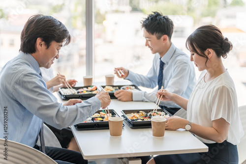 社員食堂でランチ・仕出し弁当・デリバリー・ケータリングの弁当を食べる男女(福利厚生)