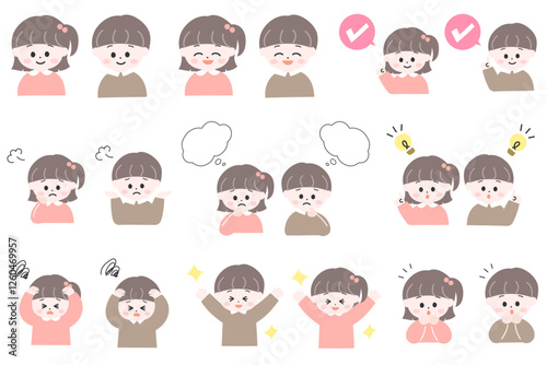 小さな日本人の男の子と女の子のさまざまなポーズや感情のセットイラスト シンプルでかわいいイラスト