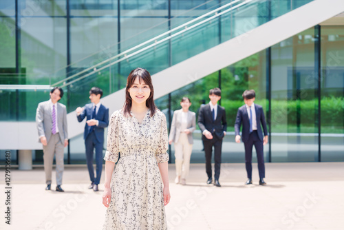 オフィスの外を笑顔で歩くキャリアウーマンと同僚