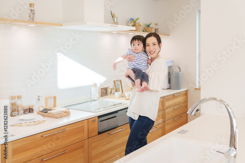 キッチンにいるママと子供