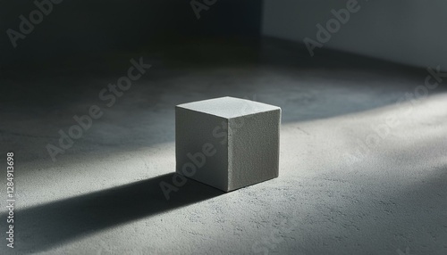 회색 콘크리트 바닥 위에 작은 정육면체 블록이 하나 놓여있다