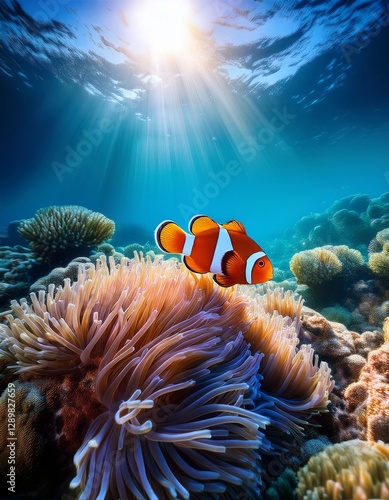 海の中の珊瑚礁とカクレクマノミの美しい光景