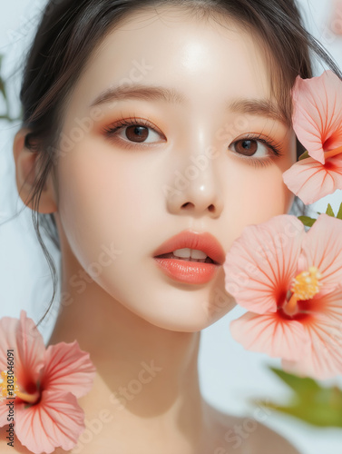 꽃에 둘러싸인 젊은 한국 여성의 꿈꾸는 듯한 클로즈업