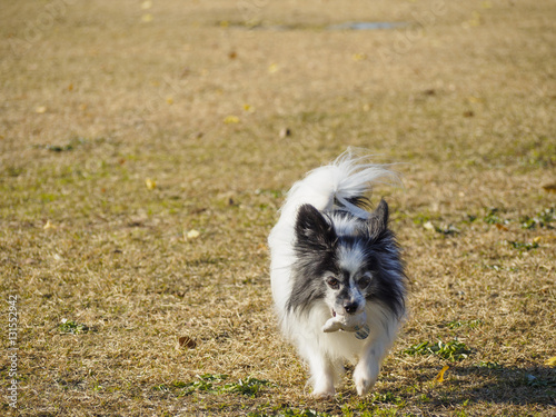 ドッグランでおもちゃを運ぶパピヨン