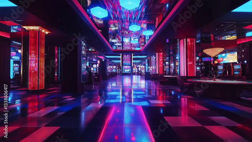 派手なネオンが輝くラスベガス風カジノ、夜のエンターテイメントが織りなす幻想的な空間
