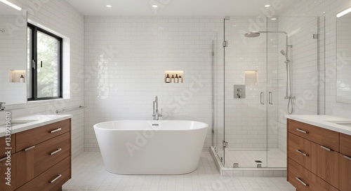 白いタイル輝くモダンバスルーム 心地よい光と清潔感