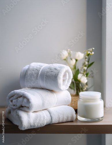 シンプルで落ち着いた浴室の外に、柔らかなバスローブとモイスチャライザーの瓶が置かれたリラックスした空間