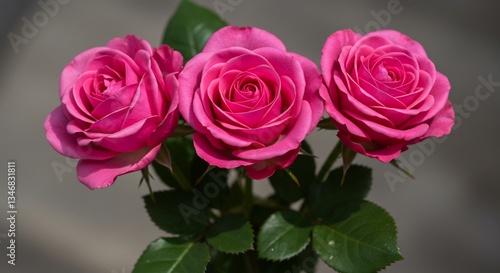 鮮やかピンクのバラ三輪 柔らかな光が優しく包む