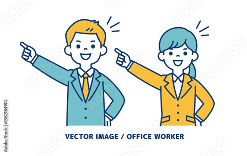 笑顔で目標を指さす、男女の会社員のシンプルなベクターイラスト素材_線の編集可能