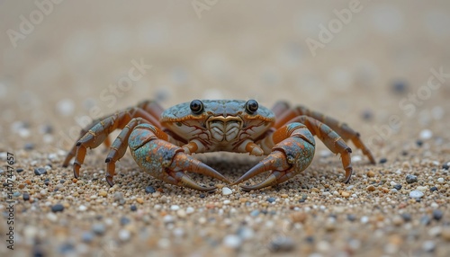 砂浜カニ 鮮やか青緑色 穏やか表情
