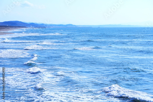 青く美しい海原と遠くに漁港を望む風景
