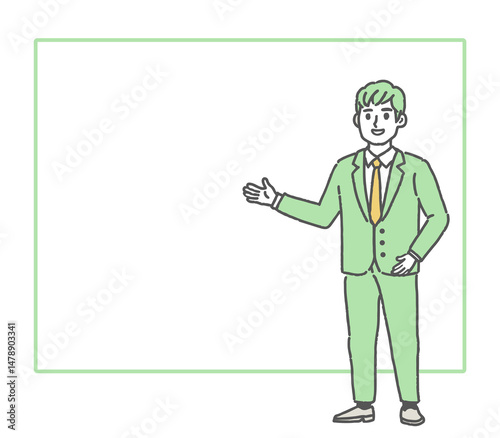 ホワイトボードの前に立って説明しているスーツ姿のビジネスマン