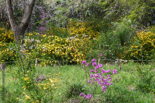 カラフルな花が方々に咲く春の公園の美しい風景 滋賀県大津市びわこ文化公園