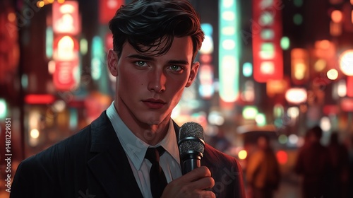 夜のネオン街でマイクを持つスーツ姿のアニメ風イケメン。 都会のナイトライフ、日本のアニメ美学、ジャーナリズムやアイドルシーン、現代の若者とメディア表現