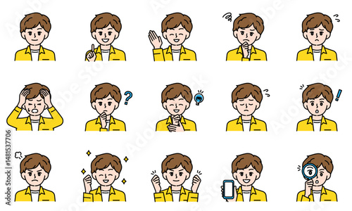 表情とポーズで感情を表すカジュアルな小学生の男の子のイラストセット