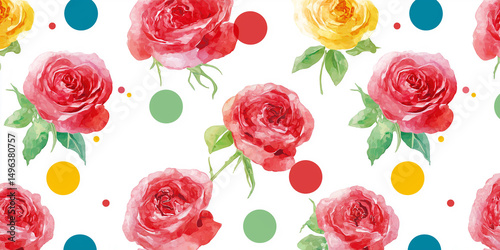 エレガントで華やかな水彩バラとドットの連続模様背景|フラワーモチーフ、シームレス、花びら、水彩風、女性向けデザイン、ラッピング、パターンアート、布地、グリーティングカード用