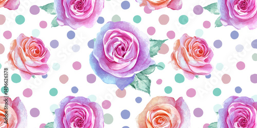水彩ローズとドットの組み合わせが可愛い、ピンク色のバラが散りばめられたナチュラルなフラワーパターン背景素材|ガーリー、春、花柄、フェミニン、壁紙、装飾、イラスト素材