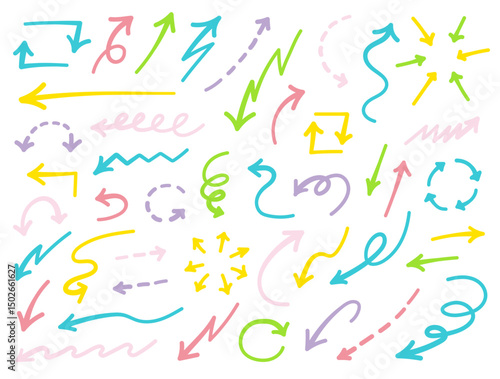 手描きの矢印のセット。シンプルな線の矢印マーク。ベクターアイコン。色んな種類のカーソル。