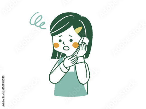 困った表情の電話で話しているエプロンを着用した女性