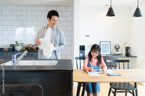 自宅で勉強をする女の子と見守る父親