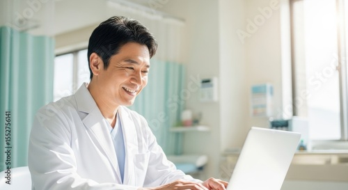 笑顔の医師がノートパソコンで患者情報入力する明るい診療所写真