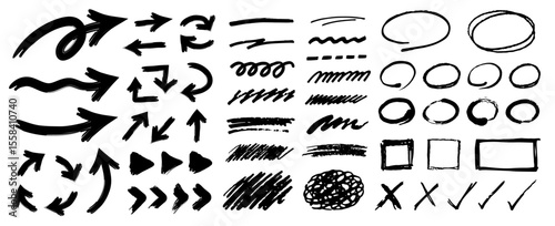 手描きの楕円、矢印、線のセット。落書き風の装飾。グランジ、落書き、筆風の図形ベクターイラスト。