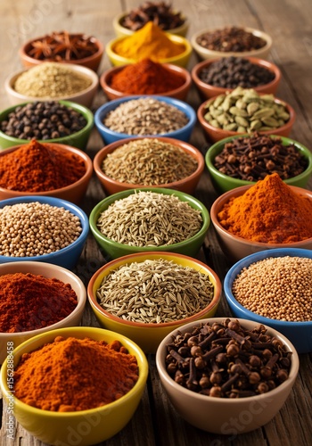 彩り豊かスパイス 木目背景 整然と並ぶ